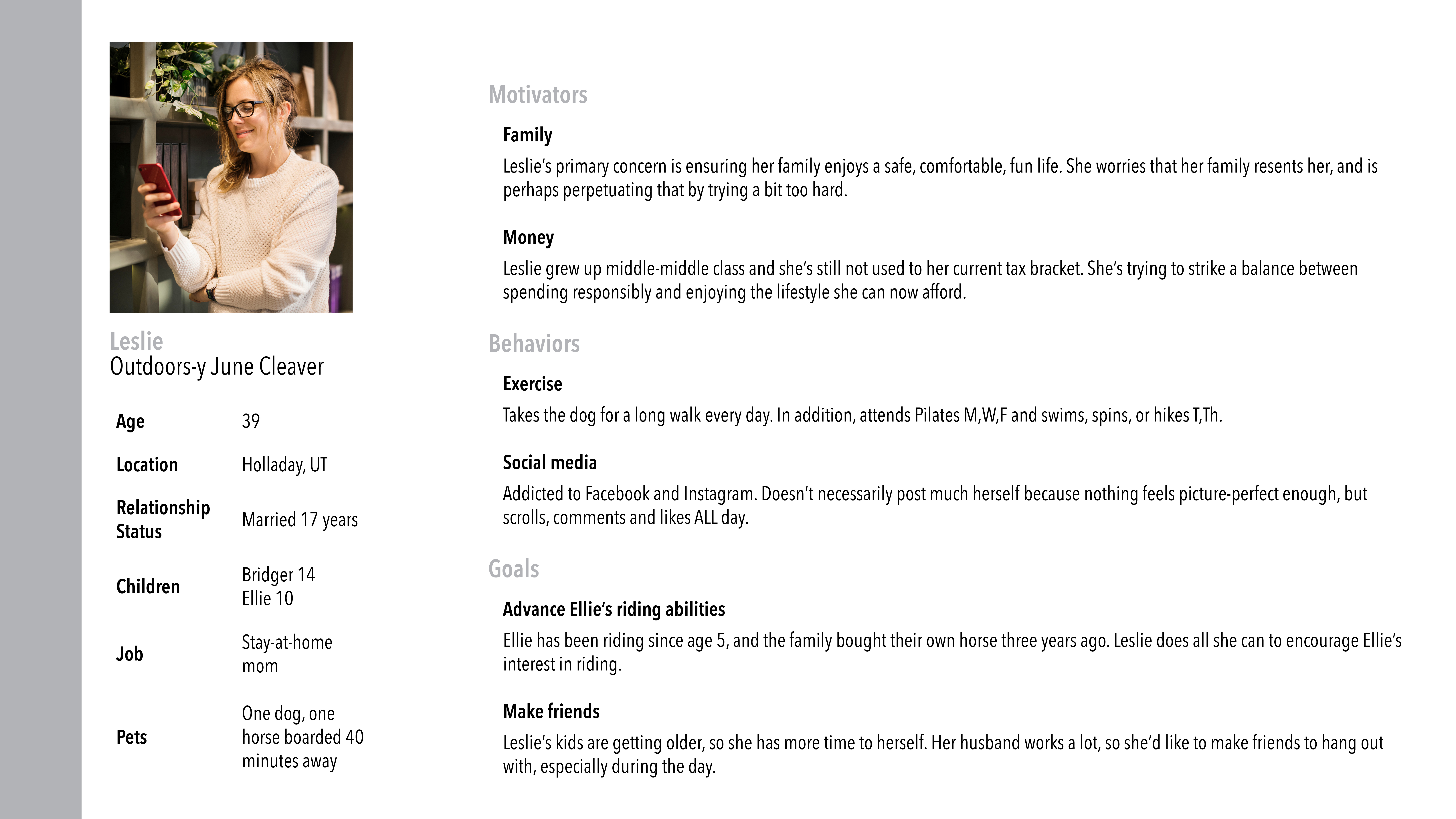 I plan to express her personality through testimonials and her about info.