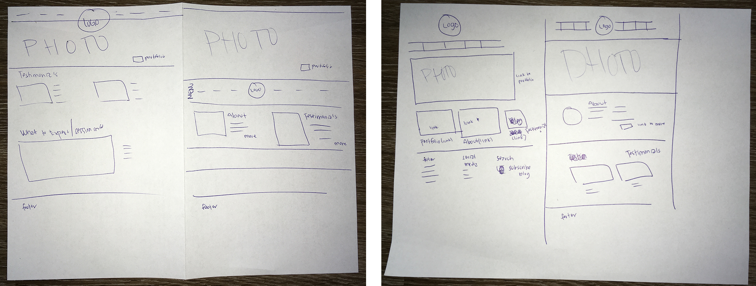 Presented one sketch to two potential users. Both were confident about reaching the portfolio page from the top menu, but only one thought to click the hero image to reach the portfolio page. I may add a button of some kind on top of or immediately below the hero image to further indicate that it is clickable.